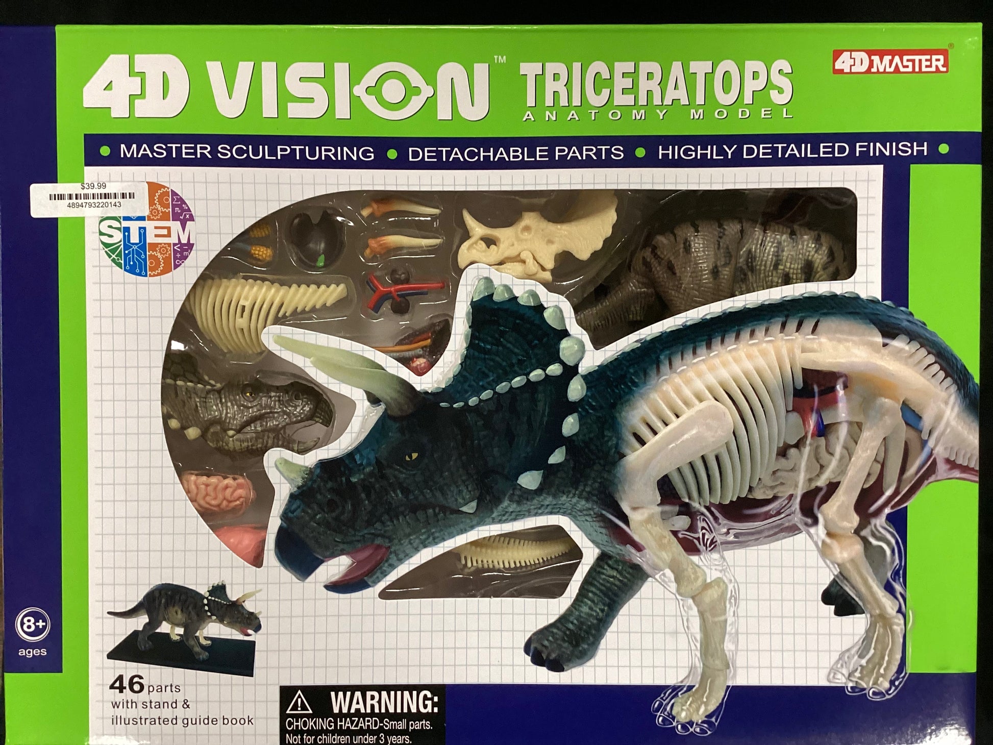 46 fully detachable organs and body parts. The model has a transparent cutaway to show internal structures. Includes display stand and illustrated guide. 7 3/4". Ages 8 & Up.