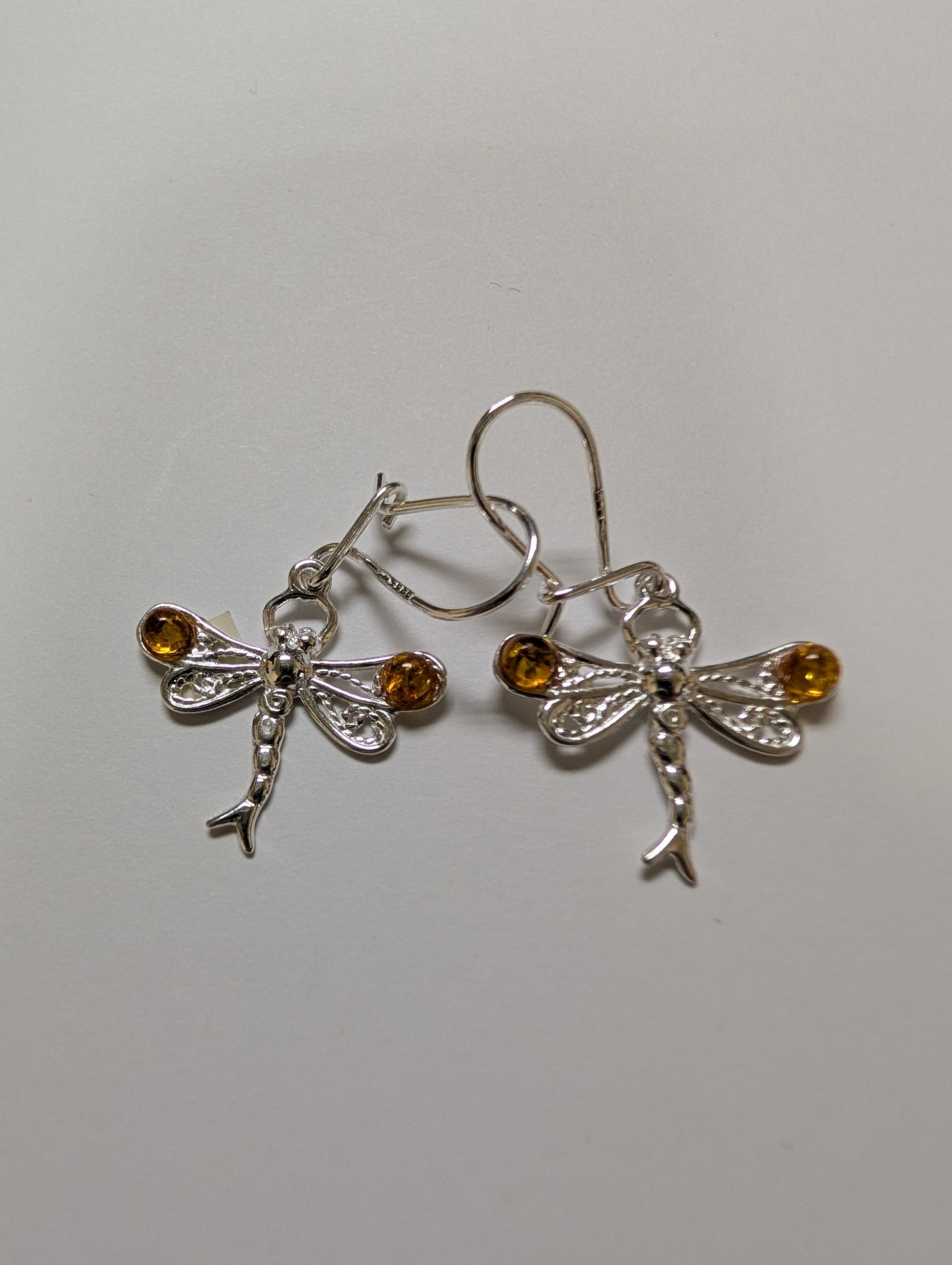Delicate silver dragonflies dance alongside genuine amber accents in these captivating earrings. These small statement pieces effortlessly elevate any outfit with natural elegance.