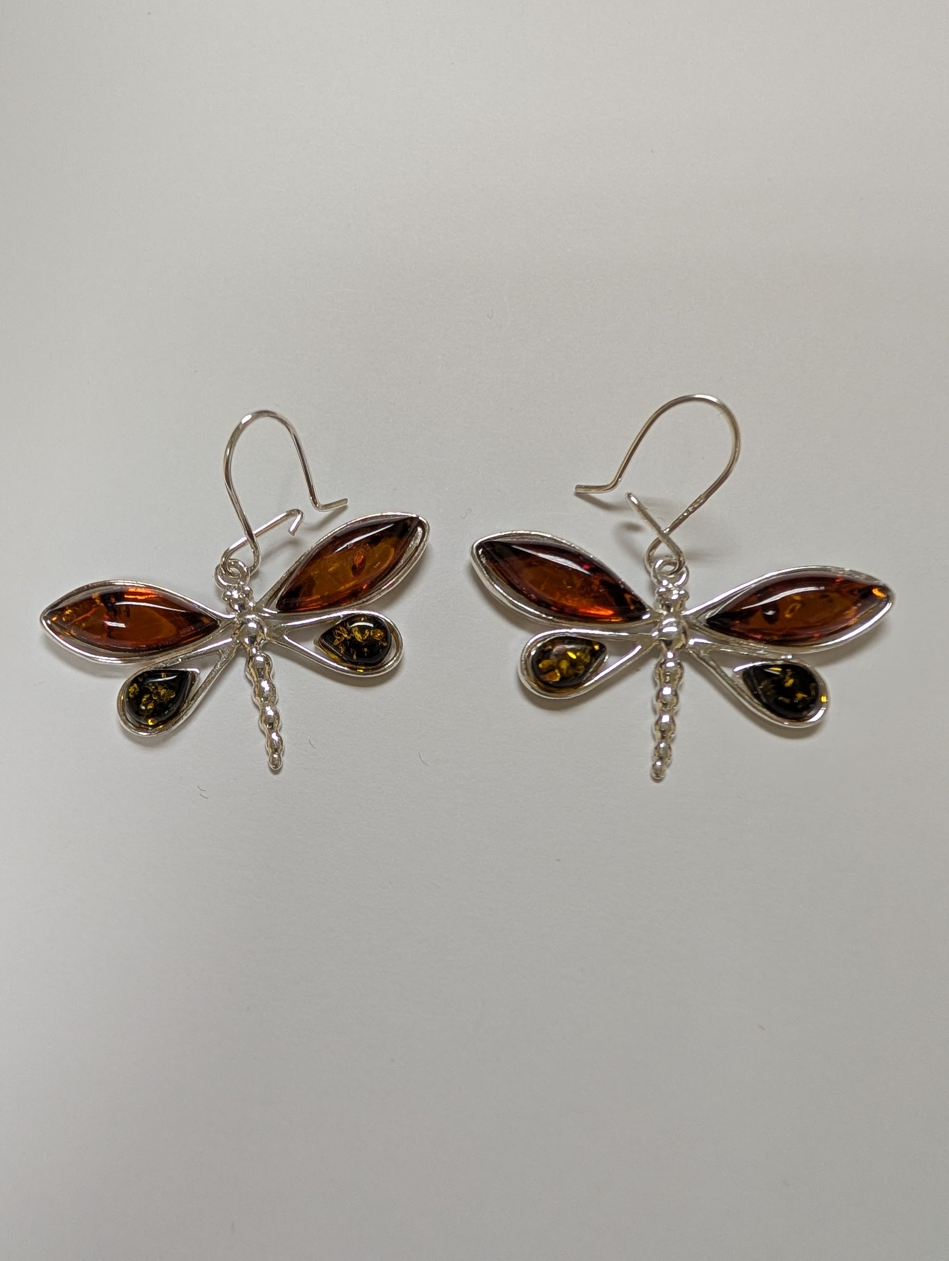 Stunning silver dragonflies dance alongside genuine amber accents in these captivating earrings. These small statement pieces effortlessly elevate any outfit with natural elegance.