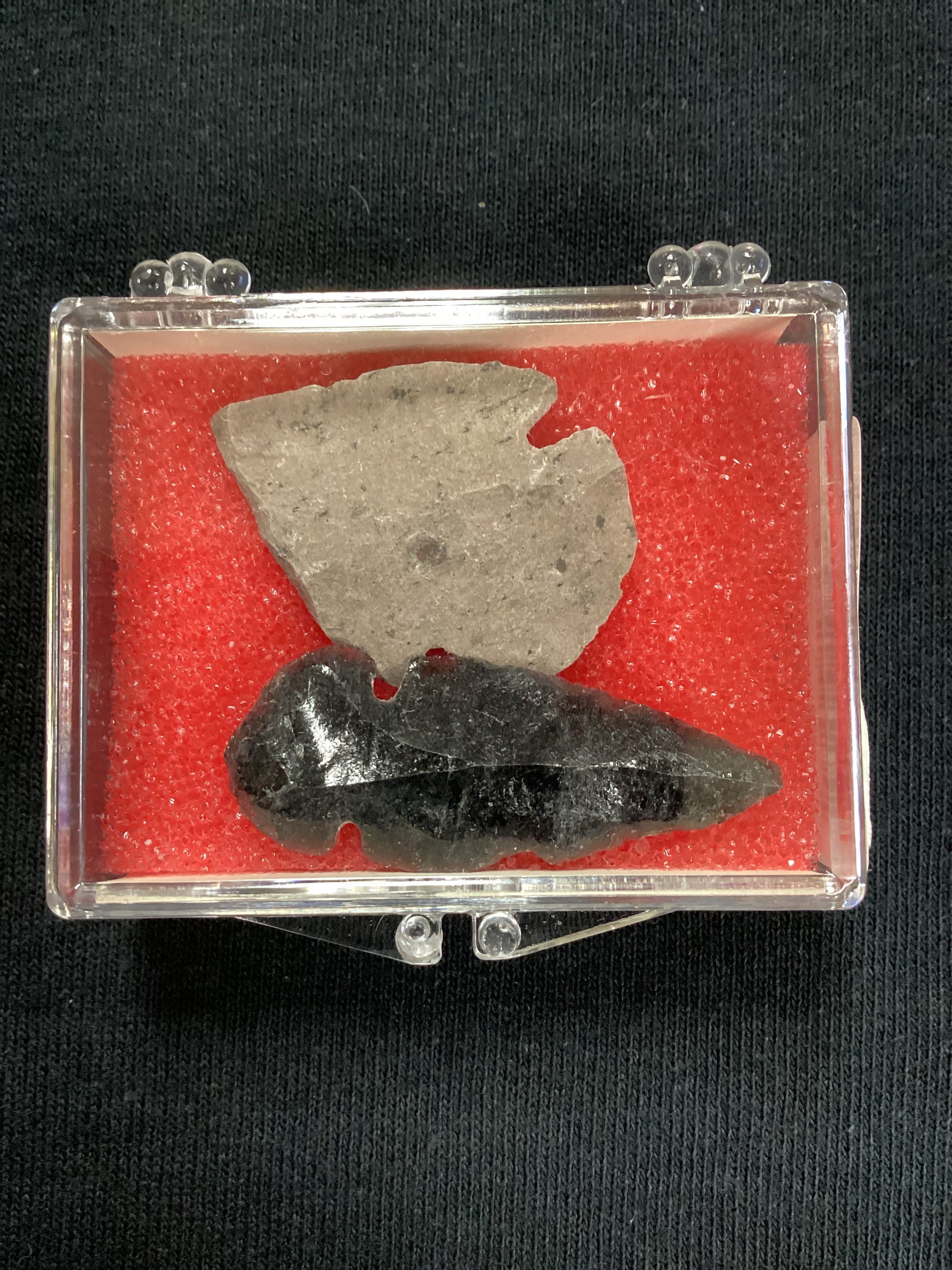 Clear plastic box filled with two small arrowheads made from high-grade minerals like obsidian, flint, and jasper. Perfect for souvenirs, each box also comes with educational info on the back.