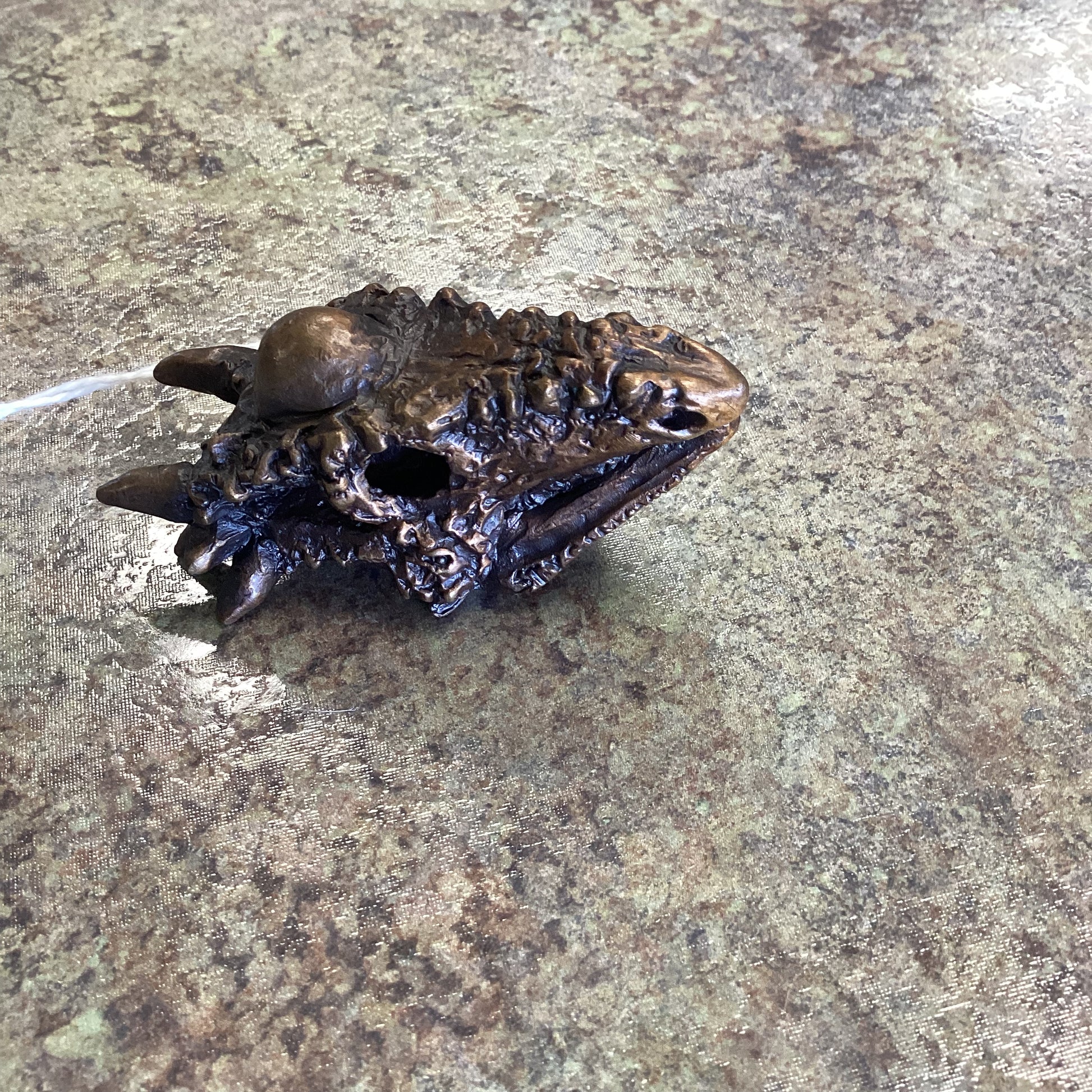 Crafted by renowned artist Pamela Harry, the Stygimoloch Skull is a bronze masterpiece. This unmounted piece showcases the ferociousness of this dragon-like creature, perfect for any dinosaur enthusiast or collector. Made with expert craftsmanship and attention to detail, it's a must-have for any bronze art collection.